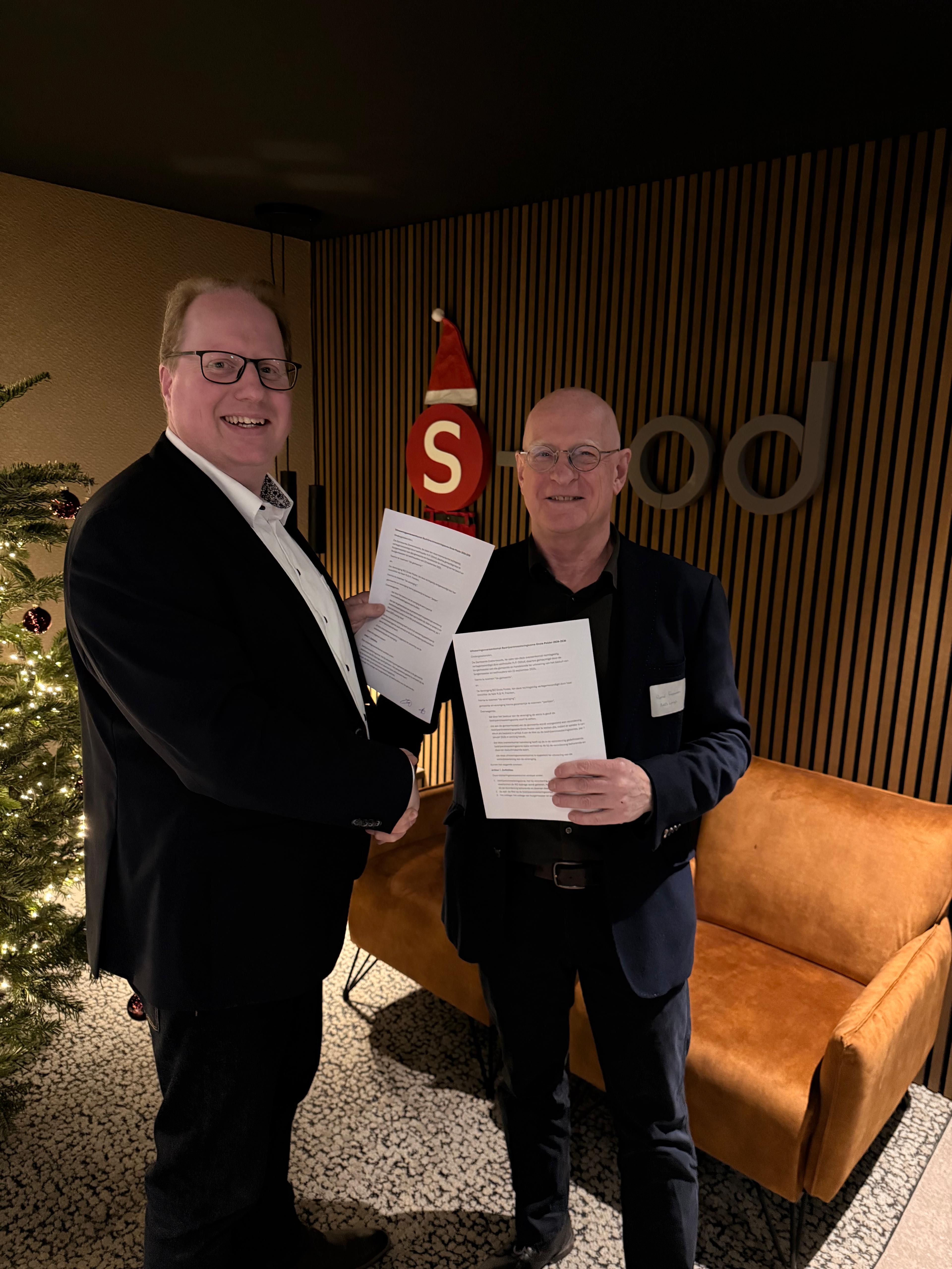 Op 17 december ondertekenden voorzitter van de BIZ Grote Polder René Frenken en wethouder Paul Olthof de uitvoeringsovereenkomst voor de komende 5 jaar. De ondertekening vond plaats tijdens de kerstborrel van de BIZ Grote Polder, die werd gehouden in de fraaie projectshowroom van S-pod Benelux BV, specialist in geprefabriceerde badkameroplossingen.